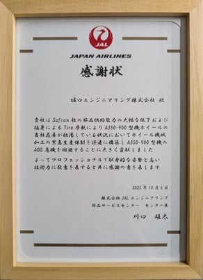 2025.10.20 ㈱JALエンジニアリング様より表彰されました コーポレート パートナーシップ 10月、株式会社JALエンジニアリング様より、A350-900型機ホイールの緊急生産体制構築への大きな貢献が認められ、感謝状を授与されました。当日は、㈱JALエンジニアリング 部品サービスセンター オペレーション統括部長様を始め、ご発注先の株式会社ジャムコ様にもご来場いただき、お褒めの言葉を賜りました。この度の感謝状を励みとして、これからもお客様のご期待に応えられるよう努めてまいります。